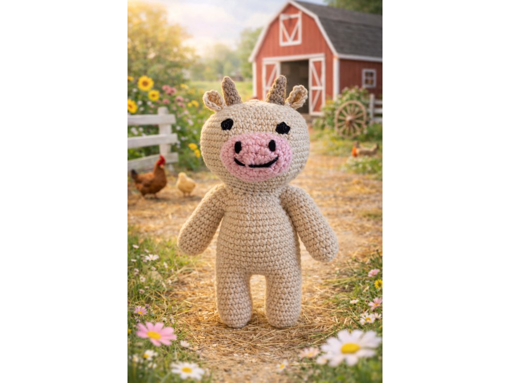 Tato háčkovaná kravička si vás získá svým veselým úsměvem a přátelským výrazem. Je ručně háčkovaná s pečlivostí a důrazem na detail, takže každý kousek je originál. Díky stojícímu tvaru působí hravě a živě – jako malý farmářský kamarád, který oživí každý dětský pokoj.