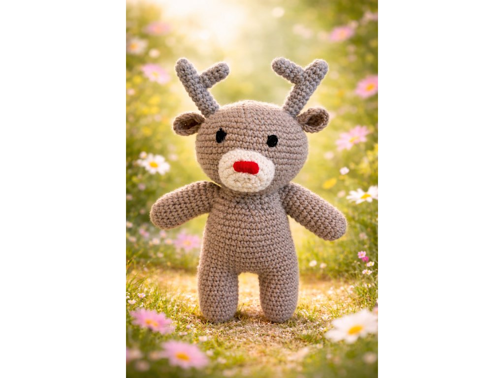 Tento háčkovaný sobík je ručně vytvořený s pečlivostí a láskou k detailu. Díky svým roztomilým parůžkům, jemnému výrazu a ikonickému červenému čumáčku působí přátelsky a hřejivě – přesně tak, jak má správný plyšový kamarád vypadat.